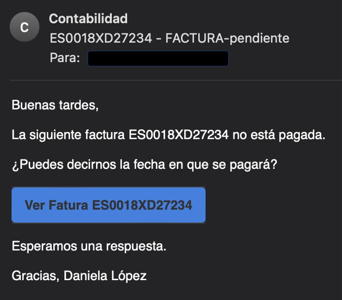 Tal y como podemos observar en la captura de pantalla anterior, los delincuentes se dirigen a la víctima con un tono familiar para ganarse su confianza y enviando su correo desde una dirección que solo muestra el nombre de “Contabilidad” pero que, en realidad, pertenece a alguna cuenta comprometida previamente de otra empresa o sitio web.