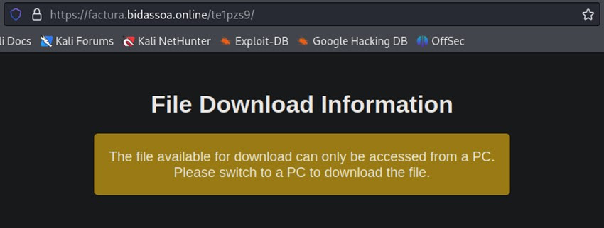 No obstante, en esta ocasión, los delincuentes han añadido algunas medidas para asegurarse de que solo los usuarios objetivo son capaces de descargar el código malicioso. De esta forma, si intentamos descargar el archivo desde una distribución de GNU/Linux, se nos mostrará el siguiente mensaje.