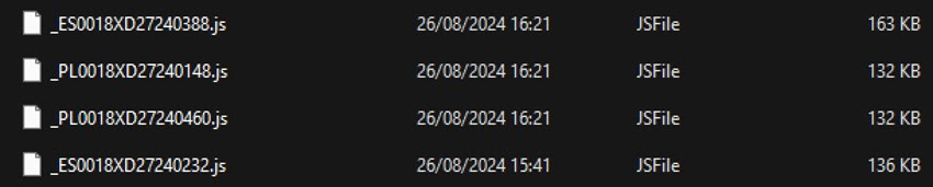 Ya que tenemos la opción, descargamos, no solo el código malicioso al que se nos redirige al pulsar sobre el enlace incrustado en el correo, sino también todas las muestras alojadas en el servidor utilizado por los delincuentes en esta campaña. Comprobamos también que se trata de ficheros JavaScript de tamaño similar y, como veremos más adelante, con cierta ofuscación.