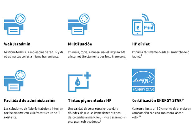 - Multifunción: impresión, copia, escaneo, envío y recepción de faxes y acceso a Internet directamente desde la impresora.