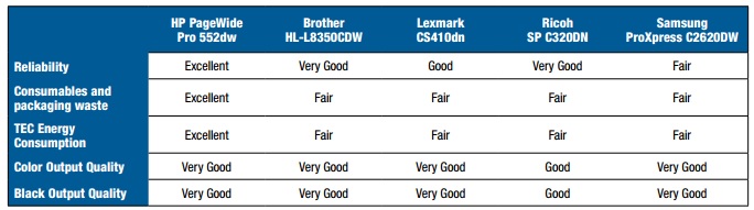 Como podemos ver en el cuadro la PageWide Pro 552dw logró estas calificaciones: