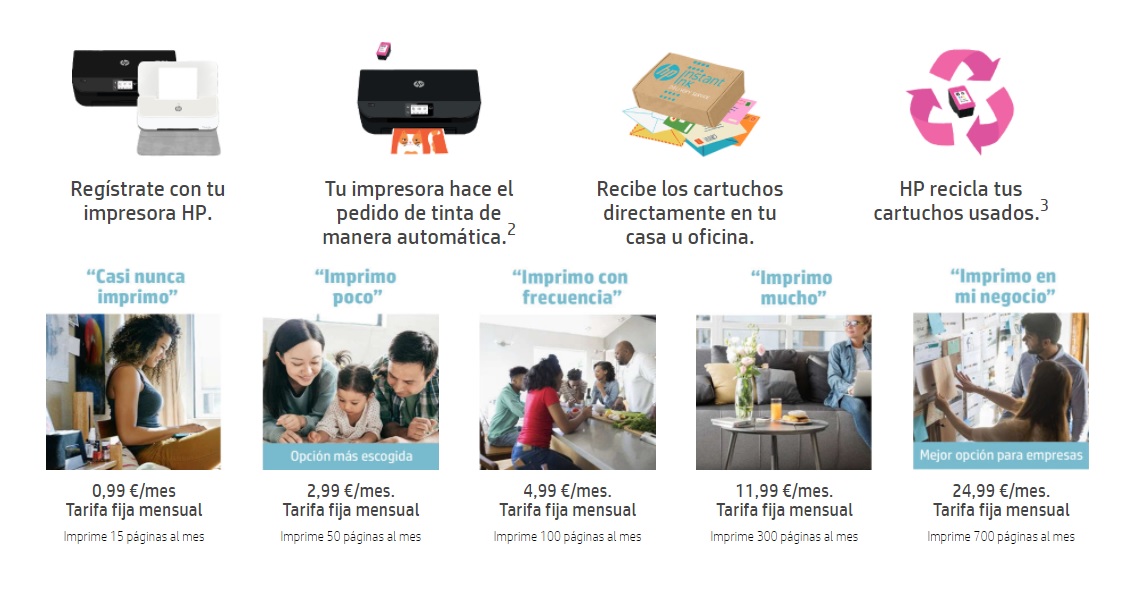 Este servicio funciona bajo un modelo de facturación basado en páginas imprimidas, y no en tinta consumida. Esto quiere decir que puedes imprimir como tú quieras, sin tener que preocuparte por la tinta ni por los costes de impresión. Al darte de alta, eliges entre uno de los cinco planes disponibles, cada incluye una cantidad determinada de páginas que puedes consumir como quieras. Si necesitas imprimir más, puedes ampliar en packs de páginas adicionales, o cambiarte de plan a uno superior.