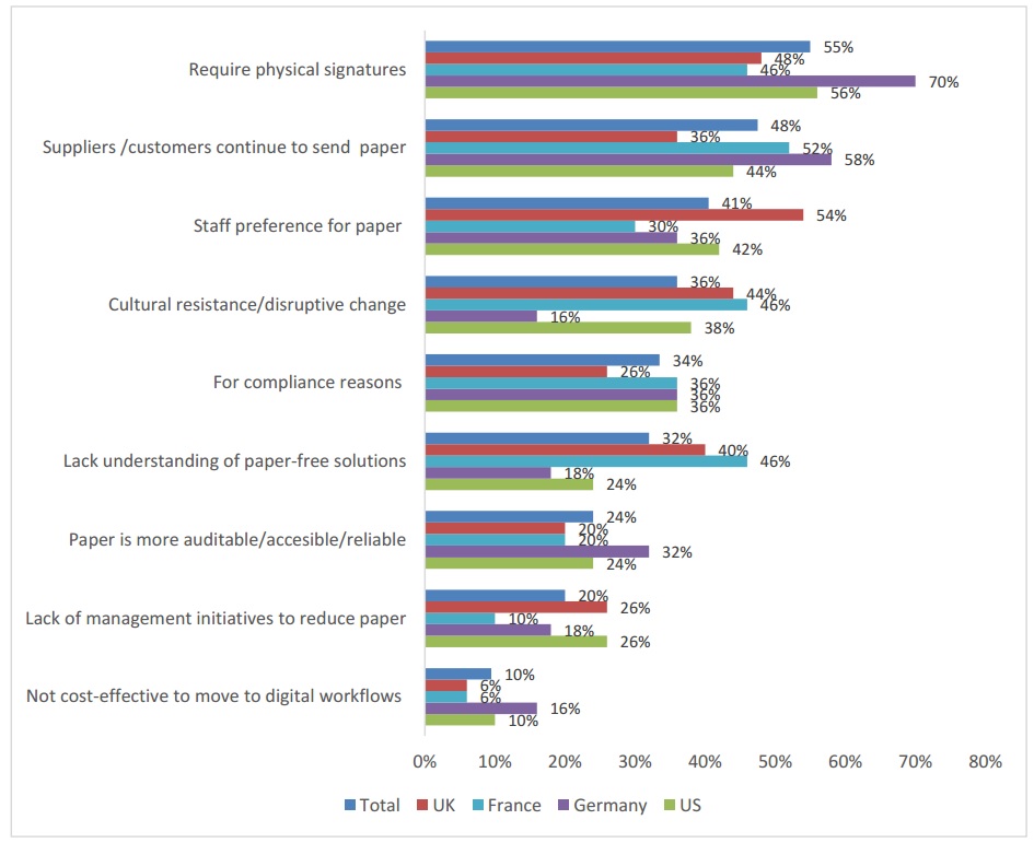 Como podemos ver en la gráfica que acompañamos el requisito de firma física, el uso continuado del papel por parte de proveedores y clientes y la preferencia del mismo por parte del propio personal son las tres razones principales que lo mantienen como una herramienta esencial en cualquier empresa.