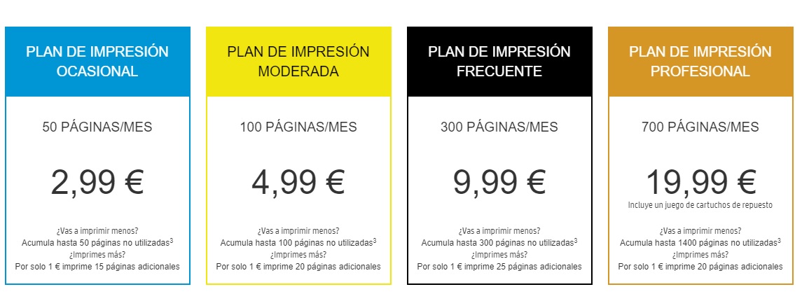 Cuando te das de alta en HP Instant Ink eliges un plan que lleva incluida una determinada cantidad de impresiones al mes. No importan la tinta que gastes para consumir esas páginas, sino el número total de páginas que hayas imprimido. Así, si por ejemplo un mes imprimes 100 páginas en negro y otro mes 100 páginas en color y con calidad alta no habrá diferencia en el coste, en ambos meses habrás pagado la misma cantidad, 4,99 euros dentro del plan de impresión moderada.