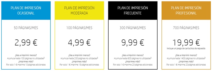 Con este plan podemos imprimir 50 páginas al mes por 2,99 euros. Si necesitamos imprimir más podemos ampliar en packs de 10 páginas adicionales por un euro.
